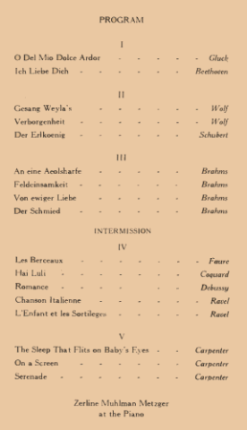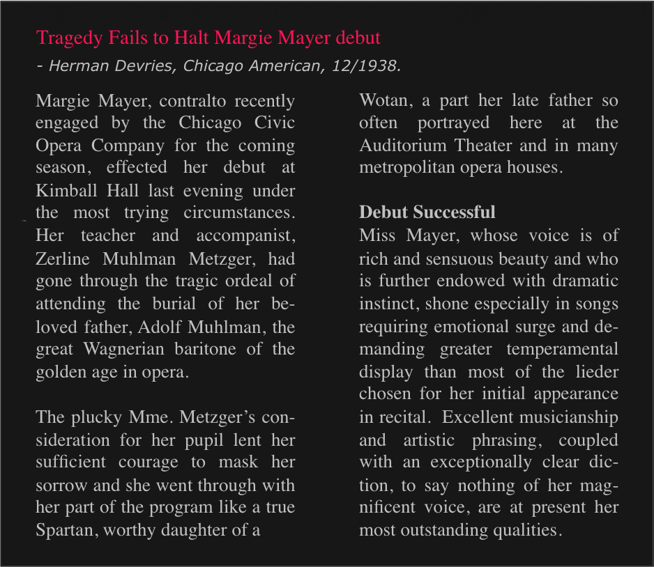 The sensation created by the radio appearances prompted the Chicago Opera Artistic Director, Paul Longone, to offer the 20-year old Mayer a contract for the upcoming 1938-39 season. Prepared and accompanied by Mme Metzger, in the spring of 1938 she also presented an enthusiastically received début recital (see program below) and was then hired as featured soloist with W-G-N Radio singing opera and classical programs with orchestra.