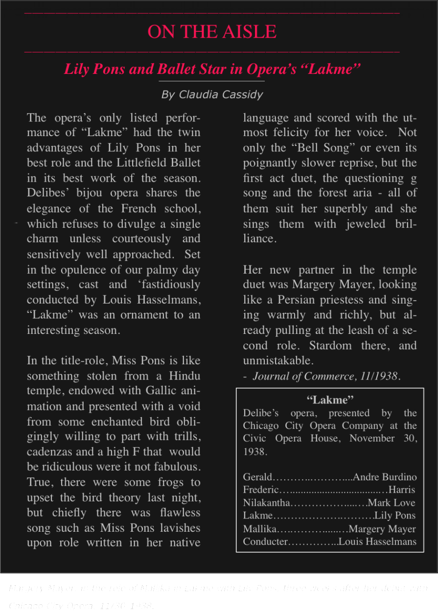 voice-over singing roles, and as she later recalled, this was the moment when she realized that singing to a camera was not her real passion. Having previously experienced the grand stage in Chicago when she would volunteer as an unpaid supernumerary, Margie realized then that her passionate desire was to sing and communicate with an audience over the footlights of an opera stage. Her vocal studies with Mme Metzger and ear training with “Dr. Leo”, stage presence and confidence cultivation with Mme Garden (a great operatic actor) had evolved her from high school student with a loud voice to a burgeoning, versatile, and quick-study as a singer and a good ear for foreign languages.